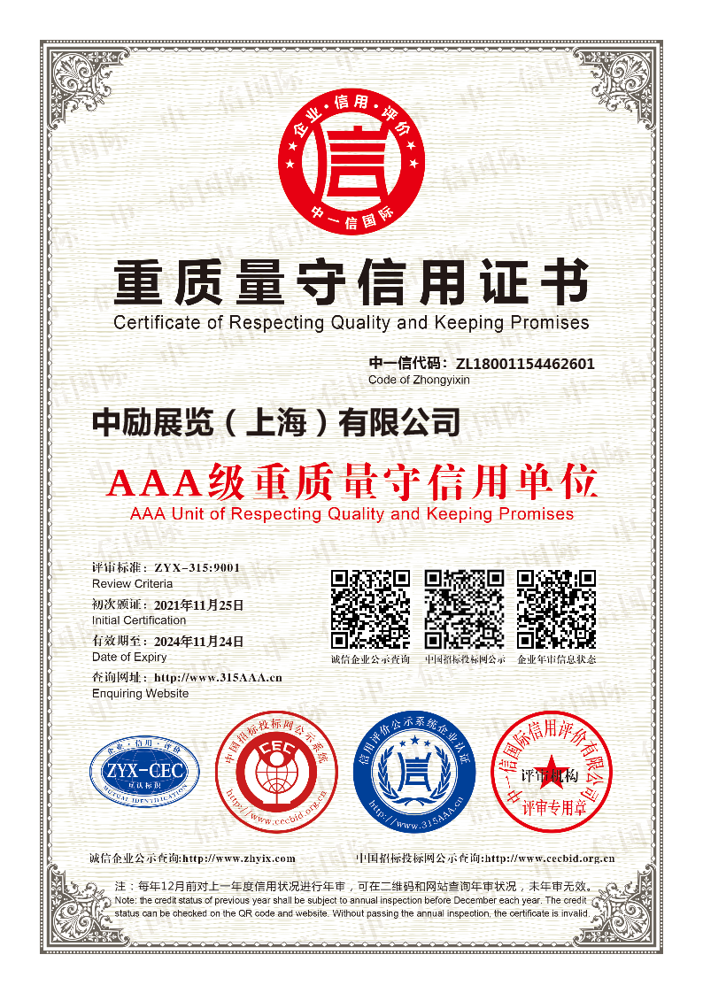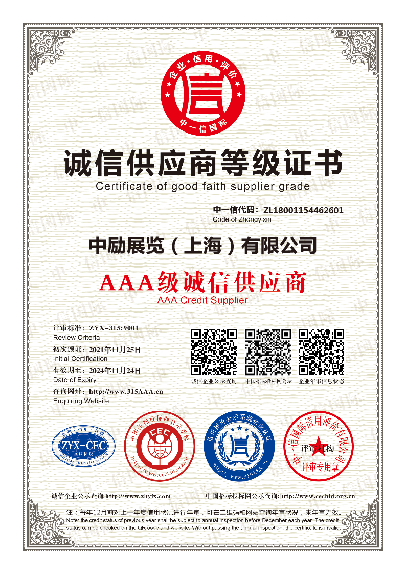 我們還獲得了來自進(jìn)博局的感謝信、AAA級誠信供應(yīng)商、AAA級重質(zhì)量守信用等級證書、ISO9001質(zhì)量管理體系認(rèn)證、ISO14001環(huán)境管理體系認(rèn)證、展陳工程設(shè)計(jì)與施工一體化壹級資質(zhì)證書、鄉(xiāng)村振興建設(shè)委員會會員單位、中國會展產(chǎn)業(yè)金手指獎-十大創(chuàng)新設(shè)計(jì)機(jī)構(gòu)獎等殊榮,進(jìn)一步彰顯了我們在追求卓越、成為值得信賴的展覽展示綜合服務(wù)商方面所獲得的成就。