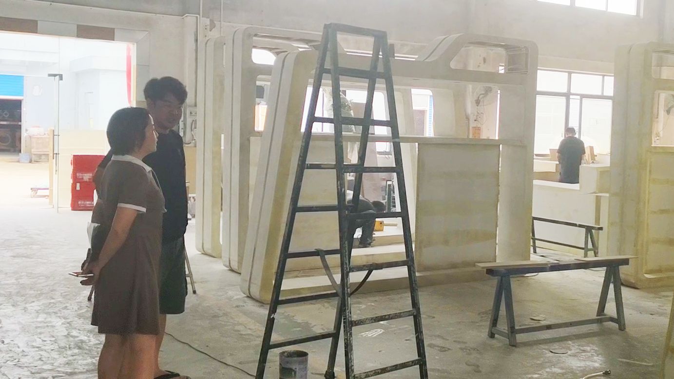 Carol在工廠檢查展臺(tái)預(yù)搭結(jié)構(gòu)情況